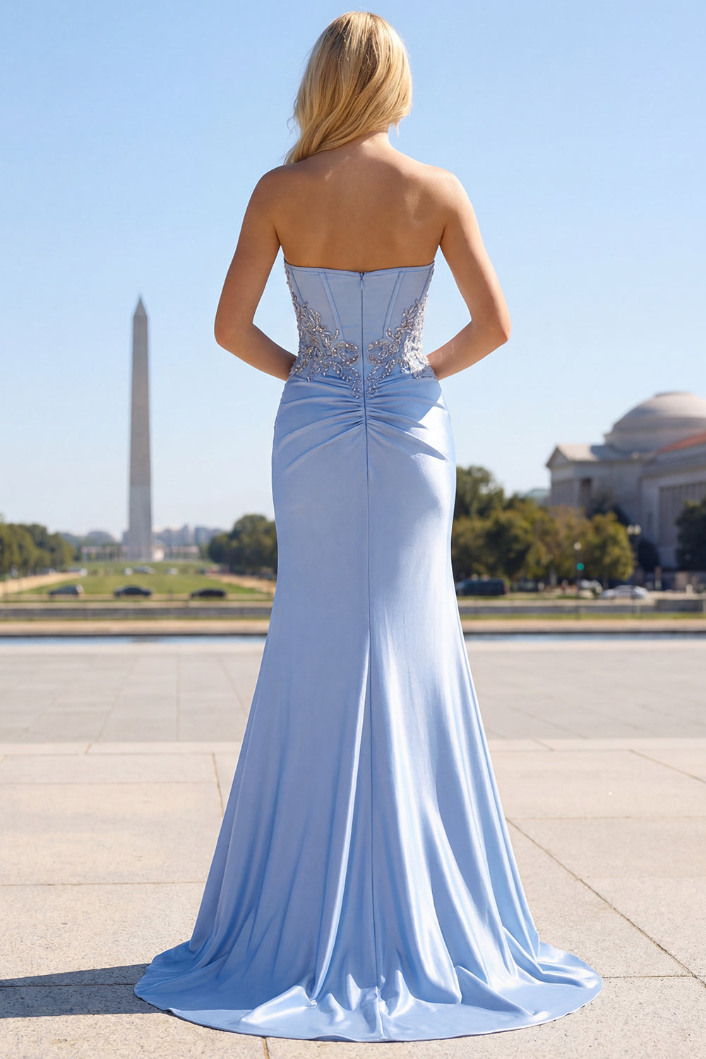 Sparkly Strapless Blue Corset Ruched Mermaid Prom Dress